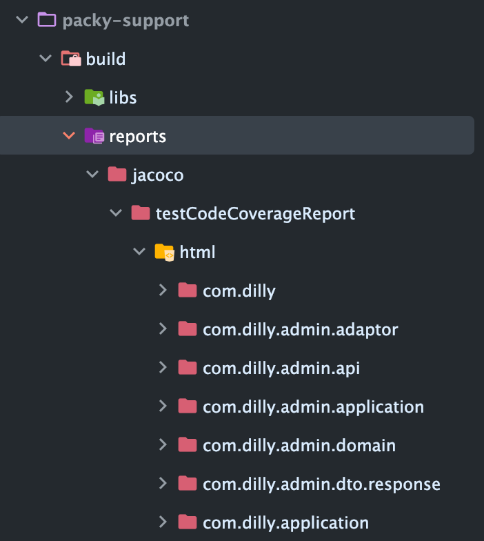 testCodeCoverageReport 명령어를 다시 실행하면 아래와 같이 build/reports 폴더에 api 모듈과 domain 모듈의 테스트 리포트가 모두 들어가 있는 모습을 확인할 수 있다.
