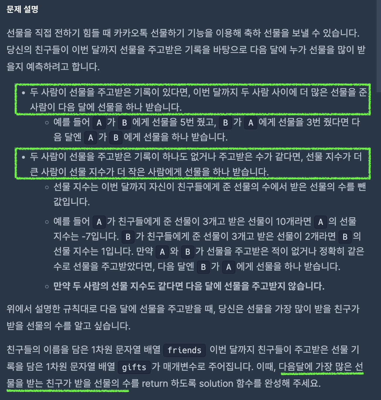 } else { // 주고받은 선물의 수가 다른 경우