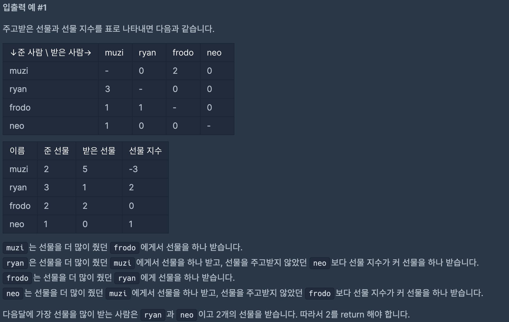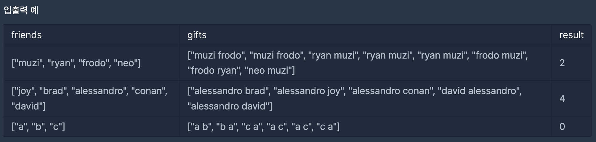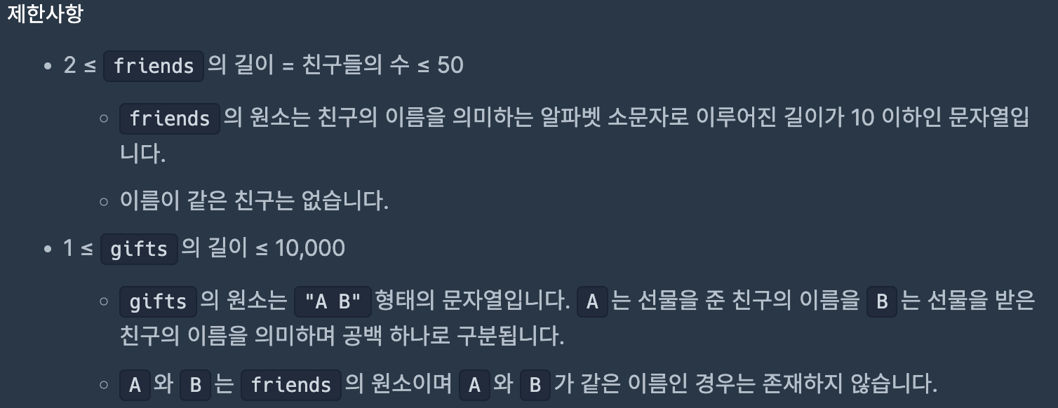 int solution(vector<string> friends, vector<string> gifts) {