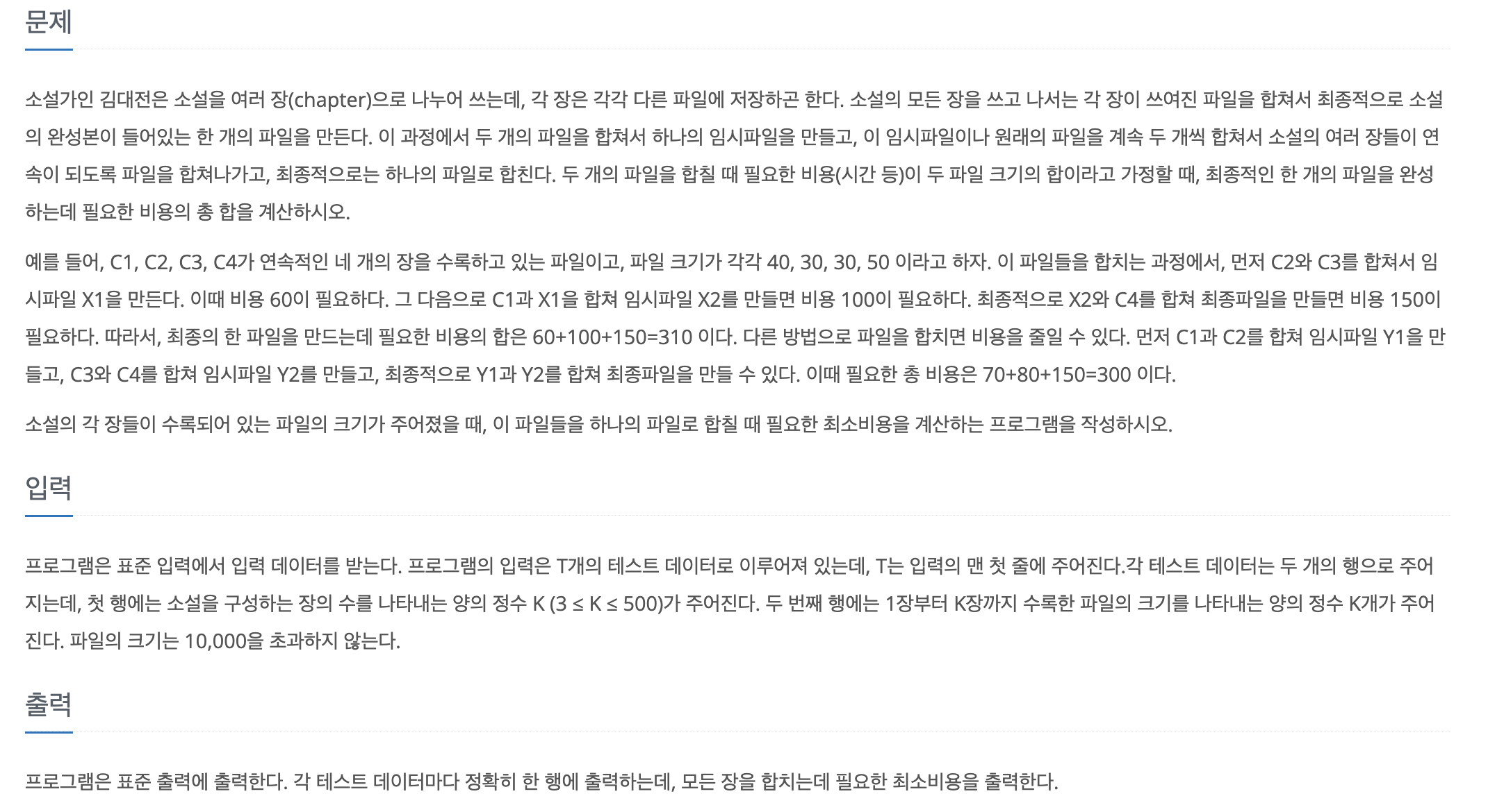 해당 지점을 l이라고 했을 때, i~j번째 파일을 합친 비용 = (i~l번째 파일을 합친 비용) + (l~j번째 파일을 합친 비용) 이다.