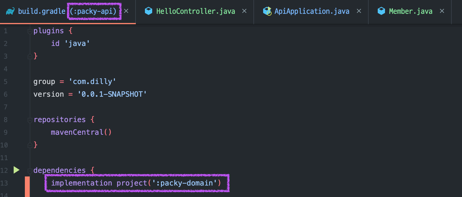 api 모듈이 domain 모듈에 의존하도록 해야하므로 api 모듈의 build.gradle에 의존성을 추가해준다.