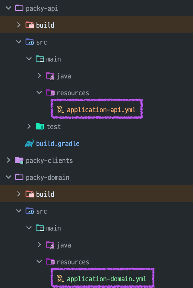 각 모듈에서 application-{모듈명}.yml로 이름을 관리하고 있다. 만약 application.yml로 이름을 짓는다면 후술할 setProperty 메서드에서 가까운 설정 파일을 읽어오기 때문에 원하는 모듈의 설정 파일을 읽어오지 못하는 일이 발생할 수 있어 모듈명을 뒤에 붙여주고 있다.